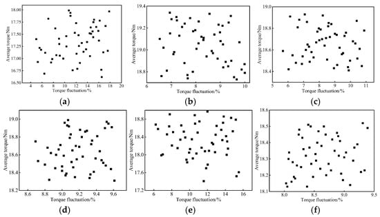 Distribution of torque performance of PMVMs under different parameter combinations: (a) conventional teeth; (b) triangular teeth; (c) circular teeth; (d) trapezoidal teeth; (e) staircase teeth; (f) tower-shaped teeth.
