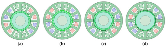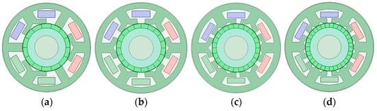 Based on the changing law of number of FMPs and permanent magnet pole pairs of a 6-slot PMVMs, different topological structures of 12-slot PMVMs are determined, as shown in Figure 16 and Table 5. Their specific parameters are shown in Table 4. B1 in Table 4 corresponds to Figure 16a, B2 in Table 4 corresponds to Figure 16b, B3 in Table 4 corresponds to Figure 16c, and B4 in Table 4 corresponds to Figure 16d, and B1–B4 corresponds to four 12-slot PMVM topologies in Figure 16. It should be noted that the outer diameter of the stator and rotor and axial length of the stator and rotor of the 12-slot PMVMs are the same as those of the 6-slot PMVMs.