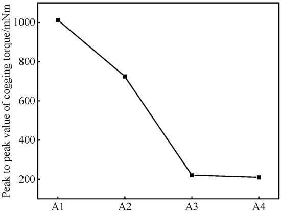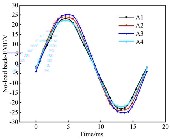 As the electromagnetic reduction ratio of the PMVMs increases, the amplitude of the -order fundamental wave of the air gap magnetic density gradually increases, and the amplitude of the -order magnetic field modulation harmonic gradually decreases. For the -order magnetic field modulation harmonic, since the number of permanent magnet pole pairs and winding pole pairs of the stator of the PMVMs satisfies the relationship in Equation (1), it can be concluded that for the above four PMVMs, their -order harmonics are all 2. Therefore, when the amplitude of the -order magnetic field modulation harmonic gradually decreases, the number of permanent magnet pole pairs also gradually increases, which can offset the effect of the decrease in the amplitude of the -order harmonic. As can be seen from the torque equation derived from the previous section, the fundamental wave and harmonic have the greatest impact on torque among all harmonic orders. Therefore, as the number of permanent magnet poles increases, the back EMF of PMVMs first increases. However, when the number of permanent magnet poles is too large, the distance between adjacent magnetic poles becomes very small, causing serious problems such as increased magnetic resistance, local saturation, and large leakage flux. Therefore, the back EMF of A4 decreases. In summary, as the number of permanent magnet poles increases, the magnetic field modulation capability of the PMVMs first increases and then decreases.