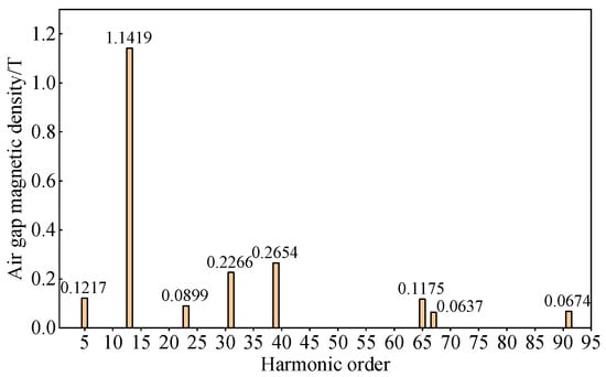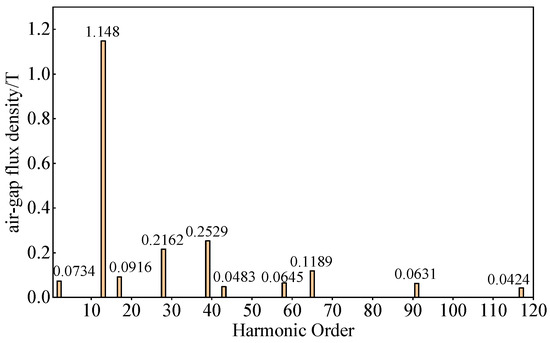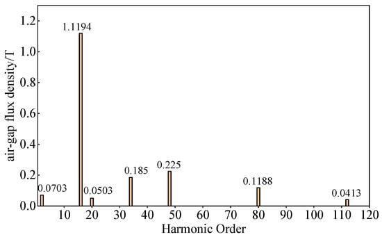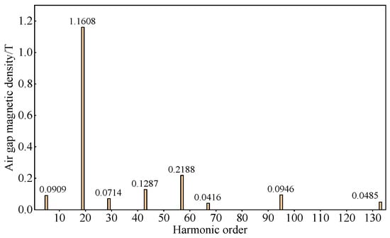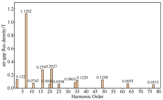 The Fourier decomposition results of the air gap flux density of different six-slot PMVMs under no-load conditions are shown in Figure 10, Figure 11, Figure 12 and Figure 13. The main harmonics of the six-slot PMVMs are listed in Table 4. In this table, is the number of pole pairs for different PMVMs, and corresponds to the number of FMPs for different PMVMs. The table displays the main harmonic orders of various PMVMs. It can be observed that the 6-slot/9-FMP/7-pole-pair PMVM has the highest number of air gap flux density harmonics, as shown in Figure 10.