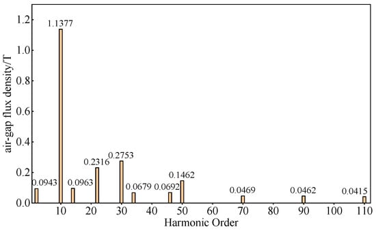As for Table 4, it can be observed that with the increase in FMPs and the number of permanent magnet pole pairs, the highest harmonic order of the air gap flux density gradually increases, the fundamental order of the rotor gradually increases, and the amplitude of -order harmonics gradually decrease, especially in Figure 11, which is particularly evident.