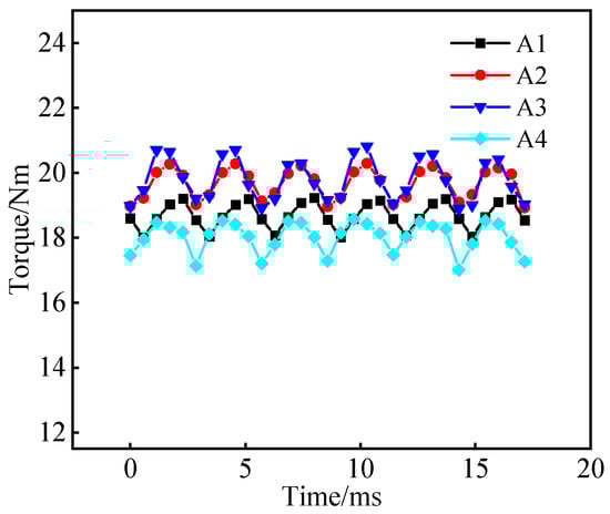 In order to better evaluate the magnetic field modulation capability of different types of 12-slot PMVMs, the torque characteristics of 12-slot PMVMs are analyzed at a rated load current amplitude of 50 A, as shown in Figure 21. It can be found that as the number of FMPs and permanent magnet poles increases, the average torque of 12-slot PMVMs gradually first increases and then decreases. At the same time, the torque fluctuation values of 12-slot PMVMs are all less than 7%. Compared to the results of six-slot PMVMs, it can be concluded that increasing the number of slots and poles can effectively reduce the motor torque fluctuation.