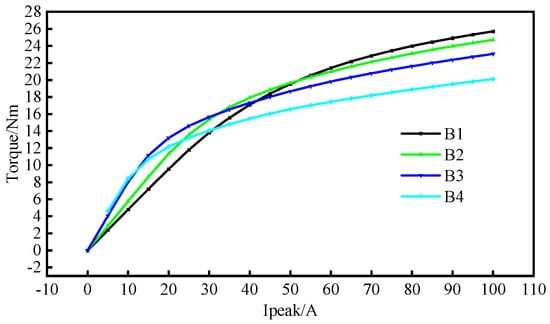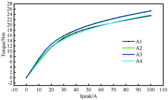 The torque of 12-slot PMVMs under different load conditions is analyzed, as shown in Figure 22. It can be seen that as the number of FMPs and the number of permanent magnet poles increase, the overload torque coefficient of the motor gradually decreases when the load current amplitude is 100 A.