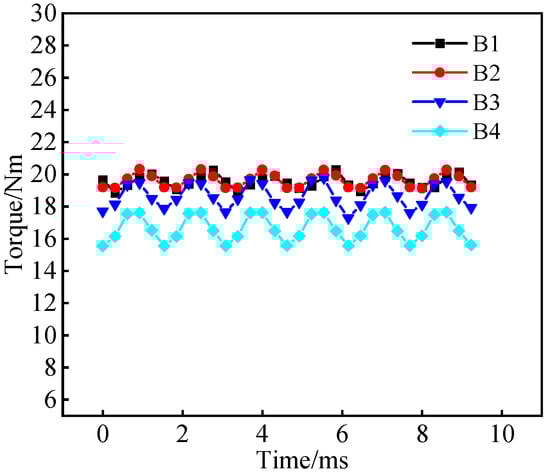 From Table 6, it can be concluded that as the number of FMPs and the number of permanent magnet pole pairs increase, the amplitude of the no-load phase back EMF of 12-slot PMVMs first increases and then decreases. The cogging torque of B1 corresponding to 12-slot/18-FMP/13-pole-pair PMVMs is the largest, and the cogging torque of B2 corresponding to 12-slot/24-FMP/19-pole-pair PMVMs is the second largest. After analysis, it can be concluded that this is because the minimum common multiple of their FMP number and the number of permanent magnet pole pairs are relatively small.