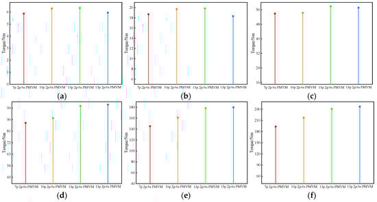 The torque variation law of PMVMs with different flatness ratios. (a) ; (b) ; (c) ; (d) ; (e) ; (f) .