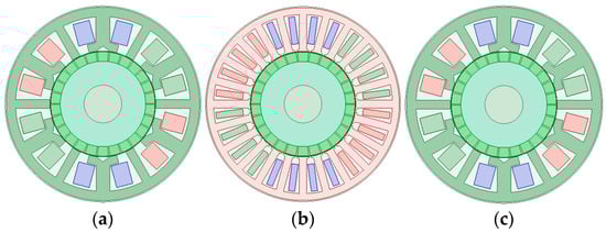 The selected PMVMs and PMSMs are shown in Figure 25. The outer diameter of the stator and core axial length of the three motors are exactly the same, with a speed of 500 rpm and a load current of 50 A. All three motors are in a rated operating condition.