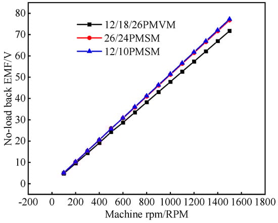The no-load back EMF amplitude of PMVMs and PMSMs by the FEA method under different speeds is shown in Figure 26. It can be seen that the no-load back EMF amplitudes of PMSMs are larger than those of PMVMs under the same rotating speed, and the peak-to-peak value of the cogging torque of PMVMs is significantly higher than that of PMSMs, as shown in Figure 27. This is because the PMVM contains rich magnetic field modulation harmonics. Therefore, reducing the cogging torque of PMVMs is also one of the main directions to optimize the electromagnetic performance of PMVMs.