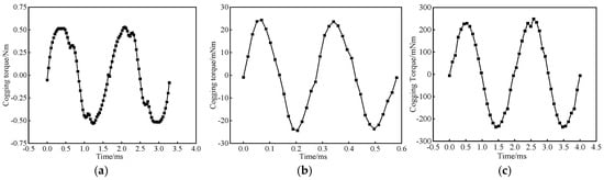 Cogging torque of PMVM and PMSM: (a) 12-slot/18-FMP/13-pole-pair PMVM; (b) 24-slot/13-pole-pair PMSM; (c) 12-slot/5-pole-pair PMSM.