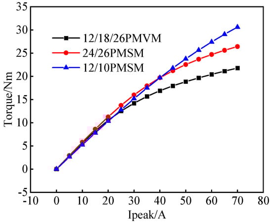 In order to evaluate the load torque characteristics of the motors in detail, the load current amplitude is set from 5 A to 100 A with a step size of 5 A. The average torque variation in PMVMs and PMSMs is studied as the load current increased. It is found that the load torque of PMVMs is always lower than that of different kinds of PMSMs, as shown in Figure 28. As is seen from Figure 28, when the amplitude of the load current is greater than 20 A, the load torque of the PMSM has a significant advantage. When the load current is 50 A, the average rated torque of the 24-slot/13-pole-pair PMSM is 22.53 Nm, the average rated torque of the 12-slot/5-pole-pair PMSM is 23.15 Nm, and the average rated torque of the 12-slot/18-FMP/13-pole-pair PMVM is 18.94 Nm, which is significantly lower than the two types of PMSMs. When the load current amplitude is 70 A, the overload torque of the 24-slot/13-pole-pair PMSM is 4.64 Nm higher than that of the PMVM, and the overload torque of the 12-slot/5-pole-pair PMSM is 8.82 Nm higher than that of the PMVM, indicating that the steady-state and overload performances of PMSMs are significantly better than those of PMVMs.