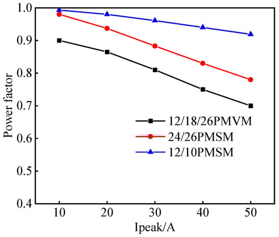 A power factor analysis of PMVMs and PMSMs is shown in Figure 29. It can be seen that the power factor of PMVMs is always lower than that of PMSMs, which explains why the overload performance of PMVMs is a lot more inferior to PMSMs.