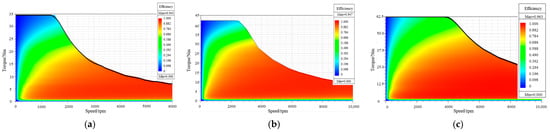 Measured efficient map: (a) 12-slot/18-FMP/13-pole-pair PMVM; (b) 24-slot/13-pole-pair PMSM; (c) 12-slot/5-pole-pair PMSM.