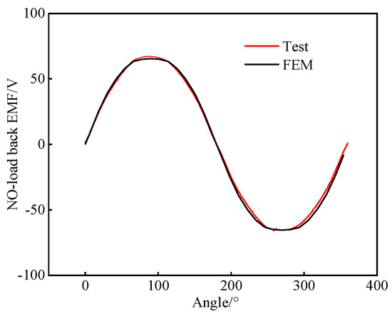 The no-load back EMF of the 12-slot/5-pole-pair PMSM at 4272 rpm is measured, and the shape of the measured waveform is almost the same as that obtained from the simulation. The maximum error between the amplitude of the simulation and the measured value is within 2.6%, which is in a small range. This verifies that the constructed simulation model of motors has high accuracy.