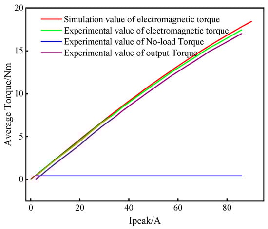 The torque of the 12-slot/5-pole-pair PMSM is measured. It can be found that the measured electromagnetic torque is relatively small, and the maximum error between the prototype value of the electromagnetic torque and simulation value of the electromagnetic torque is within 2%, which verifies that the constructed torque simulation model has high accuracy. The possible reasons for errors mainly include the following: the prototype is powered on for a long time, resulting in significant heating and a certain decrease in electromagnetic performance, and during the measurement of output torque, frictional resistance causes the test results to decrease.