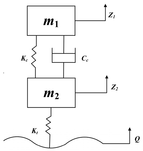 where m1 represents sprung mass; m2 represents unsprung mass; Kc represents suspension stiffness; Cc represents suspension damping coefficient; Kt represents tire stiffness; and Q represents road excitation.