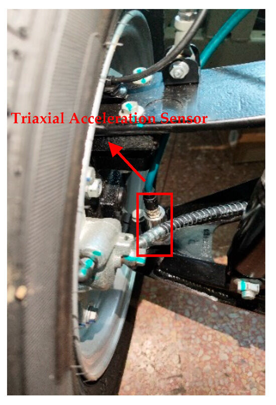 To ensure accurate measurement of the unsprung mass vertical vibration response, an external mounting bracket was designed at the wheel position. The bracket is equipped with a positioning module, which prevents lateral and longitudinal displacement of the vibration sensor during vehicle operation. The setup is shown in Figure 2.