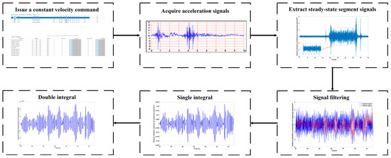 During the experiment, it is necessary to ensure that the vehicle runs at a constant speed. Given that the vehicle cannot maintain a constant speed during the initial starting phase, only the steady-state portion of the collected signals was analyzed. It is worth noting that even when the steady-state segment of the vehicle speed is selected, the process of double integration of the acceleration signal is still vulnerable to the interference of low-frequency noise and sensor zero drift [37]. When performing double numerical integration on the acceleration signal, even a tiny amount of noise may be amplified and accumulated during the integration process, leading to significant errors, which in turn affects the accurate estimation of the vertical displacement of the wheel or road roughness. Therefore, before integrating the acceleration signal, it is necessary to conduct routine signal preprocessing such as filtering and detrending on the collected original signal. Only after completing these preprocessing steps can the vertical vibration displacement of the wheel center during the vehicle’s running be calculated more reliably. The specific acquisition and processing procedures are illustrated in Figure 3.