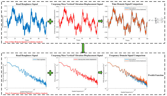 Since road roughness signals are the external excitation causing vehicle vibration, the vertical vibration response of the vehicle is closely related to road roughness [38]. To verify the consistency between road roughness signals and vehicle unsprung vibration response signals, this study will adopt a combined time-domain and frequency-domain approach. The specific verification steps are as follows: