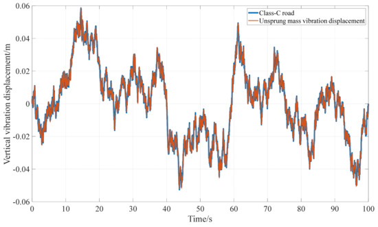 Time-domain comparison between Class-C road profile and unsprung mass vibration displacement.