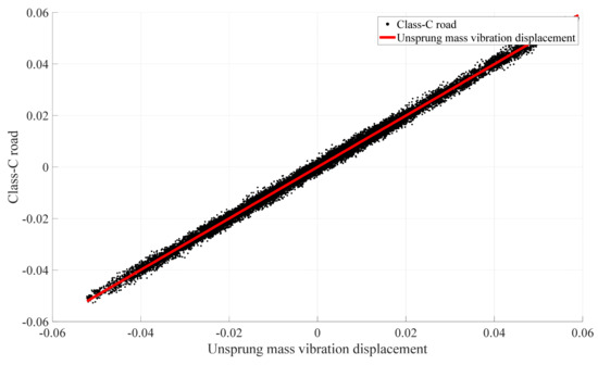 As shown in Figure 5, the displacement of the unsprung mass vibration demonstrates a high degree of consistency with the input road profile in the time domain. To quantitatively assess their relationship, a correlation analysis was conducted between the unsprung mass vibration displacement and the Class-C road profile. The results indicate a strong correlation, with an R2 value of 0.997, as illustrated in Figure 6.