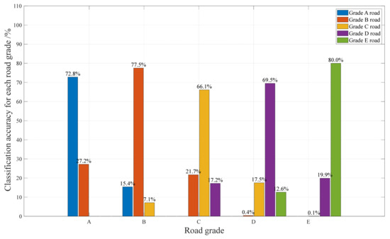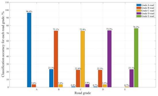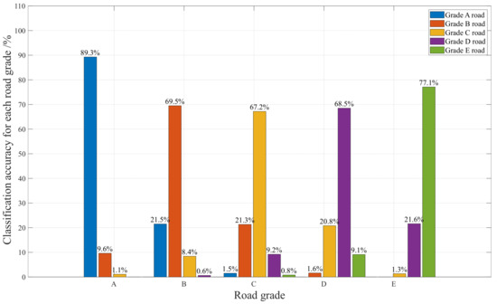 As shown in Figure 10, the horizontal axis represents the true road grades in the simulation environment, while the vertical axis indicates the classification accuracy achieved by the classifier for each grade. Each bar, distinguished by color, corresponds to a different road grade (blue: Grade A, red: Grade B, orange: Grade C, purple: Grade D, and green: Grade E). The classification accuracy for each grade is explicitly annotated above the respective bars. Specifically, without the incorporation of vehicle speed feature, the SVM classifier achieves the highest classification accuracy for Grade A road (96.4%), with only a small proportion of samples (3.6%) misclassified as Grade B. For Grades B to E, the classification accuracy significantly decreases, and a common trend is observed: a relatively high misclassification rate between adjacent grades, with approximately 26.9%, 26.3%, 25.8%, and 23.8% of samples misclassified into neighboring grades, respectively. Overall, the SVM classifier achieves a comprehensive classification accuracy of 78.41%.