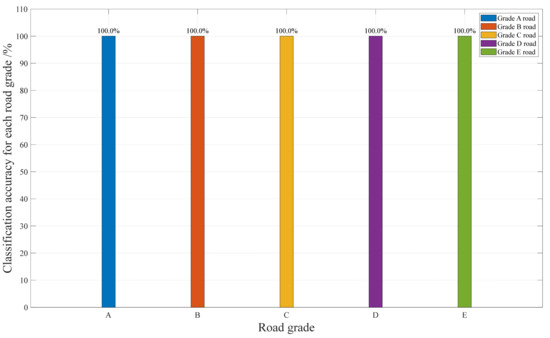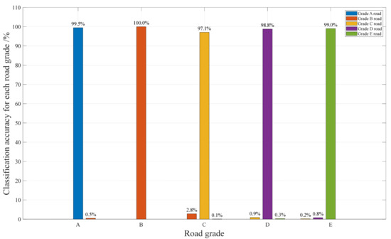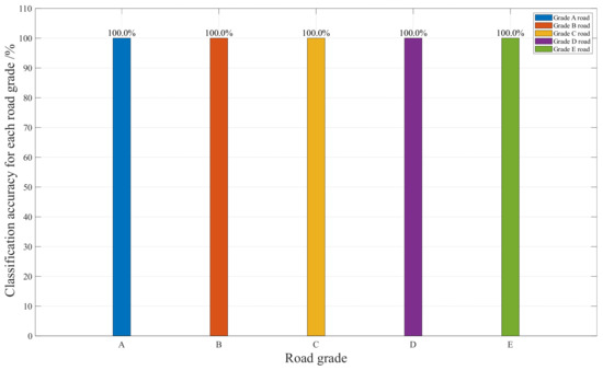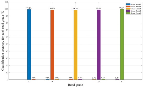 In this section, the recognition performance of different classifiers is compared. SVM is used to train the aforementioned 6000 sample data, while 54,000 data samples from the original road roughness database are used for testing. Considering the large volume of data, a bar chart illustrating the classification accuracy of the SVM-based road roughness classifier without incorporating the vehicle speed feature is provided for a more detailed analysis, as shown in Figure 10.