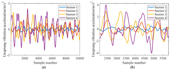 Time-domain comparison of unsprung acceleration across four road segments at a speed of 10 km/h. (a) the whole sample; (b) the partial sample.