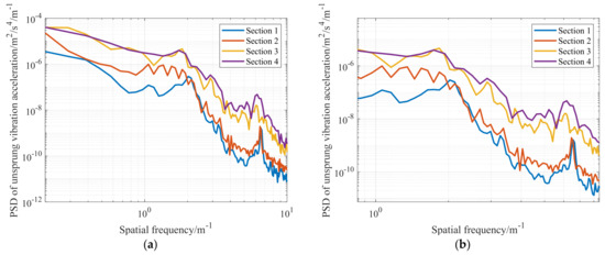 From Figure 5 and Figure 6, it can be observed that the unsprung mass vibration displacement exhibits a high degree of alignment with the simulated input road profile in the time domain. To further analyze their relationship, the spatial frequency was restricted to the range of 0.01~2.83 m−1. The detailed results within this range are shown in Figure 7.