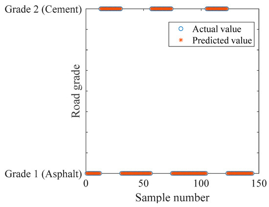 As shown in Figure 25, the speed-adaptive KNN classifier accurately distinguishes the road surfaces into two categories, achieving a classification accuracy of 100%, which is consistent with the results demonstrated in Figure 23 and Figure 24.