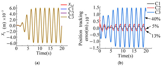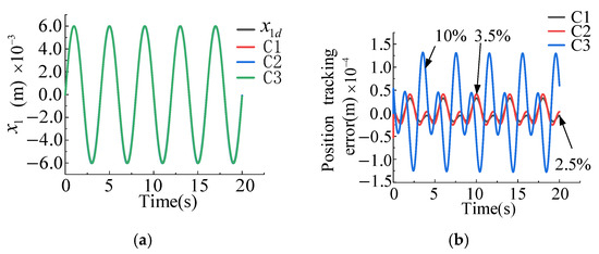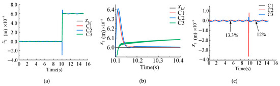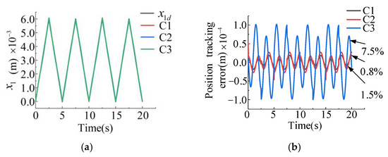 When the input signal is a step signal, Figure 9a shows the tracking effects of three different controllers, while the magnified view of the tracking effects of the three different controllers is presented in Figure 9b, and the tracking error comparison is shown in Figure 9c. The simulation results show that the two controllers, C1 and C2, based on backstepping control design will have significant tracking errors when facing severe mismatches in position states. As can be seen, for the C1 controller the control error is within about 12% and for the C2 controller the control error is within roughly 13.3%. Compared to the controller C2 based on standard LESO design, the controller C1 designed in this article, based on a cascaded structure observer, has a smaller tracking error, while the high-gain PID controller C3 does not show any position mutation through the high-gain coefficient. However, through Figure 9b, it can be observed that the entire system is in an unstable working state.