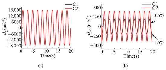 The comparison of the estimation performance of the two observers for a given external disturbance is collected in Figure 6. The simulation results show that both observers can achieve good tracking performance for external disturbances and approximate parameters, and the tracking lag of the two observers for external disturbances is almost invisible. According to the estimation error reflected in Figure 6b, the estimation error of external disturbance for C1 is within approximately 25% and for C2 the estimation error of external disturbance is within about 50%. Therefore, it can be observed that due to the cascade structure the observer used in C1 has a smaller estimation accuracy error for external disturbances, which also explains that under the same controller parameters and position instructions the control error of C1 is smaller.