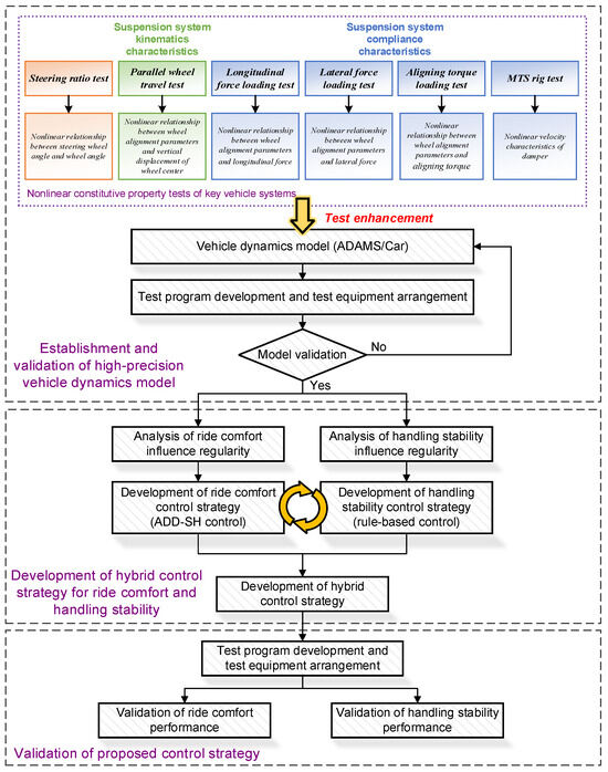 Figure 1 shows the process of vehicle semi-active suspension hybrid control strategy research. Firstly, the nonlinear constitutive property tests of key vehicle systems (steering system and suspension system) are conducted. Then, the multi-dimensional vehicle performance representation model based on test enhancement is established and validated. Subsequently, the ride comfort and handling stability influence regularities are analyzed. Based on the above analysis, the hybrid control strategy is developed, which utilizes the ADD-SH control logic for vertical motion control and trigger rule-based control logic for both lateral and longitudinal motion control. Finally, the control strategy is validated based on the ride comfort and handling stability tests.