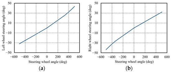 Steering ratio test results. (a) Relationship between left front wheel angle and steering wheel angle. (b) Relationship between right front wheel angle and steering wheel angle.