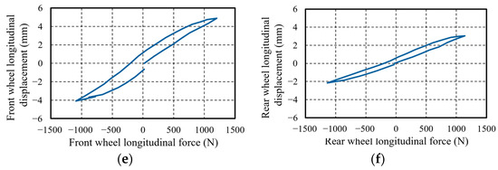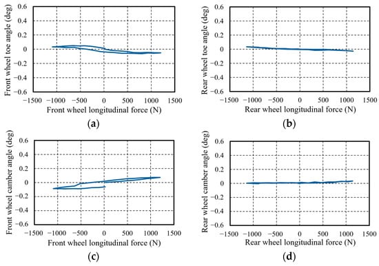 Suspension system compliance characteristics describe the variation in wheel alignment parameters induced by forces and torques at the tire–road interface. The relationships between wheel center longitudinal force and toe angle, camber angle, and wheel longitudinal displacement were obtained from the longitudinal force loading condition test, as shown in Figure 5.