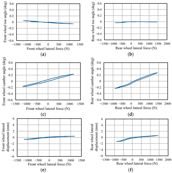 The relationships between wheel center lateral force and toe angle, camber angle, and wheel lateral displacement were obtained from the lateral force loading condition test, as shown in Figure 6.