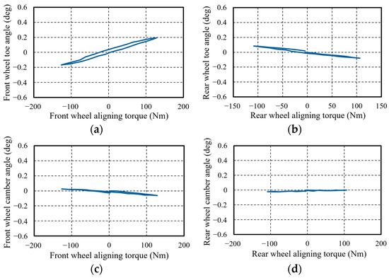 The relationships between wheel center aligning torque and toe angle and camber angle were obtained from the aligning torque loading condition test, as shown in Figure 7.