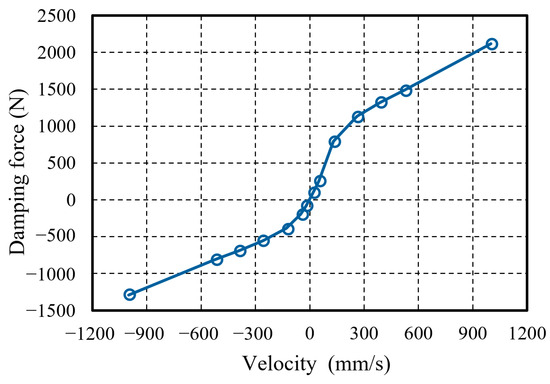 The velocity characteristics of the damper passive state were measured by the MTS test rig [45]. The test employed fixed displacement amplitude with varying frequency, and the test velocities are 20, 50, 130, 260, 390, 520, and 1,000 mm/s. The damper velocity characteristic curve is shown in Figure 8.