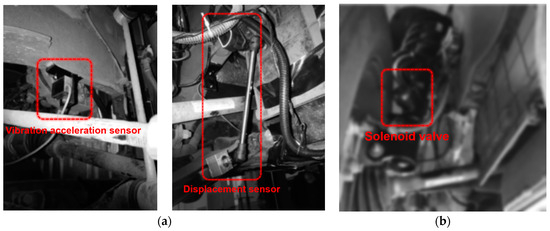 Sensor arrangement schemes and test site. (a) Vibration acceleration and displacement sensor mounting positions. (b) CDC damper mounting positions.