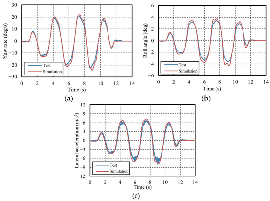 According to the standard GB/T 6323-2014, the serpentine test was conducted at a vehicle speed of 70 km/h [48]. During the test, the time course of the yaw rate, roll angle, and lateral acceleration were recorded. The comparisons between the simulation and test curves are shown in Figure 11, while the corresponding parameter results are shown in Table 4. It can be observed that the simulation results align well with the test results under serpentine conditions.