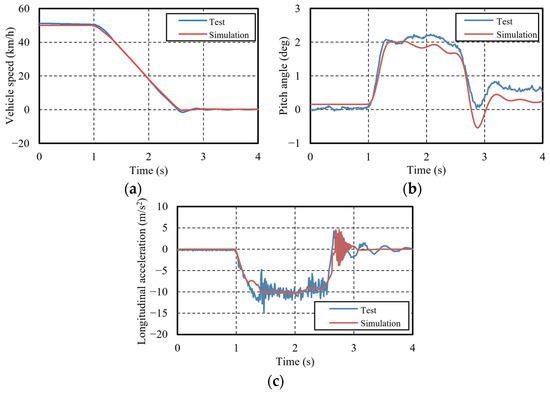Comparison of simulation and test curves for brake test. (a) Vehicle speed. (b) Pitch angle. (c) Longitudinal acceleration.