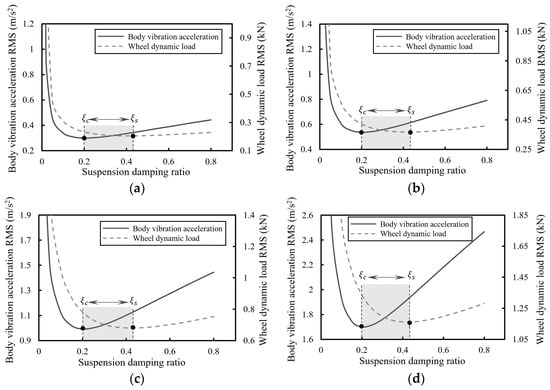 To investigate the influence of the suspension damping ratio on the ride comfort metrics [50], four typical driving conditions, namely, an A grade road under a vehicle speed of 100 km/h, a B grade road under a vehicle speed of 80 km/h, a C grade road under a vehicle speed of 60 km/h, and a D grade road under a vehicle speed of 40 km/h, were selected [51,52]. The variation trends of body vibration acceleration and wheel dynamic load root mean square (RMS) with the suspension damping ratio are shown in Figure 13. It can be observed that optimal damping ratios ξc and ξs exist for minimizing the RMS values of both vehicle body acceleration and wheel dynamic load across all conditions. In addition, ξc and ξs remain independent of both road surface grade and vehicle speed. Within the optimal damping ratio range (ξc to ξs), the following trends are observed: (1) the body acceleration RMS consistently increases with increasing damping ratio; (2) the wheel dynamic load RMS consistently decreases with increasing damping ratio; and (3) the sensitivity of the RMS values of both vehicle body acceleration and wheel dynamic load to damping ratio variations becomes progressively more pronounced as road conditions deteriorate. These findings indicate that ride comfort and driving safety need to be harmonized and compromised in this range.
