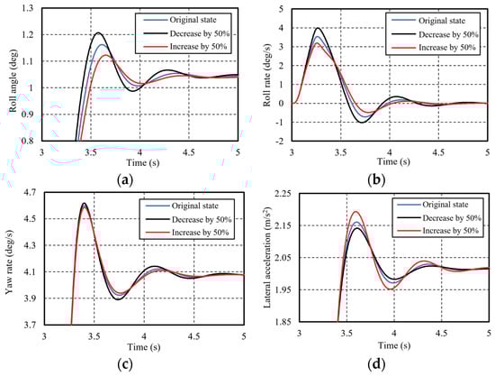 Figure 14c,d show that the variations in damping characteristics will affect the response peak and fluctuation amplitude of the yaw rate and lateral acceleration. It can be seen that increasing damping during steering maneuvers can improve the transient response characteristics of the yaw and lateral direction, so that the yaw rate and lateral acceleration tend to stabilize faster.