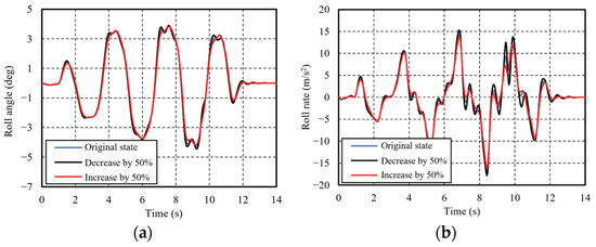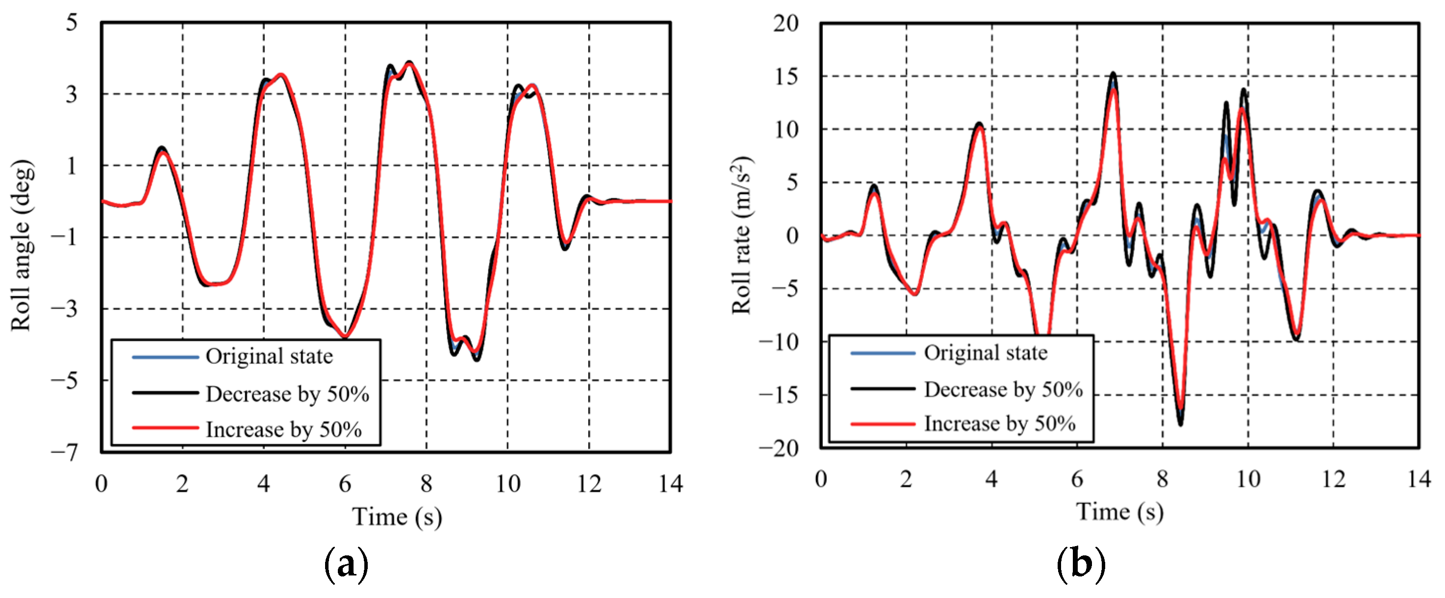 Under a vehicle speed of 70 km/h, the time course response curves of suspension performance for the serpentine test are shown in Figure 15. It can be seen that variations in damping characteristics affect the peak values of both roll angle and roll rate, with a more noticeable influence on the peak roll rate. These findings demonstrate that increasing damping during continuous steering can improve the roll resistance to a certain degree.