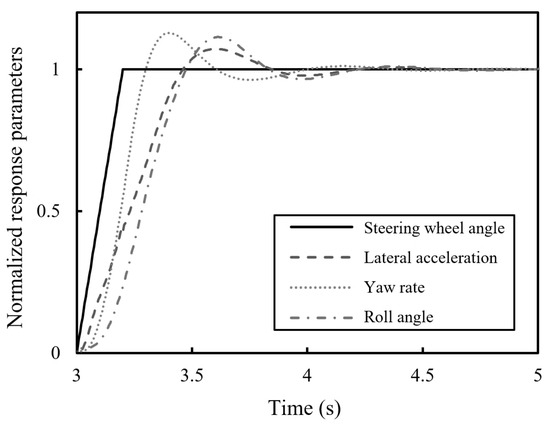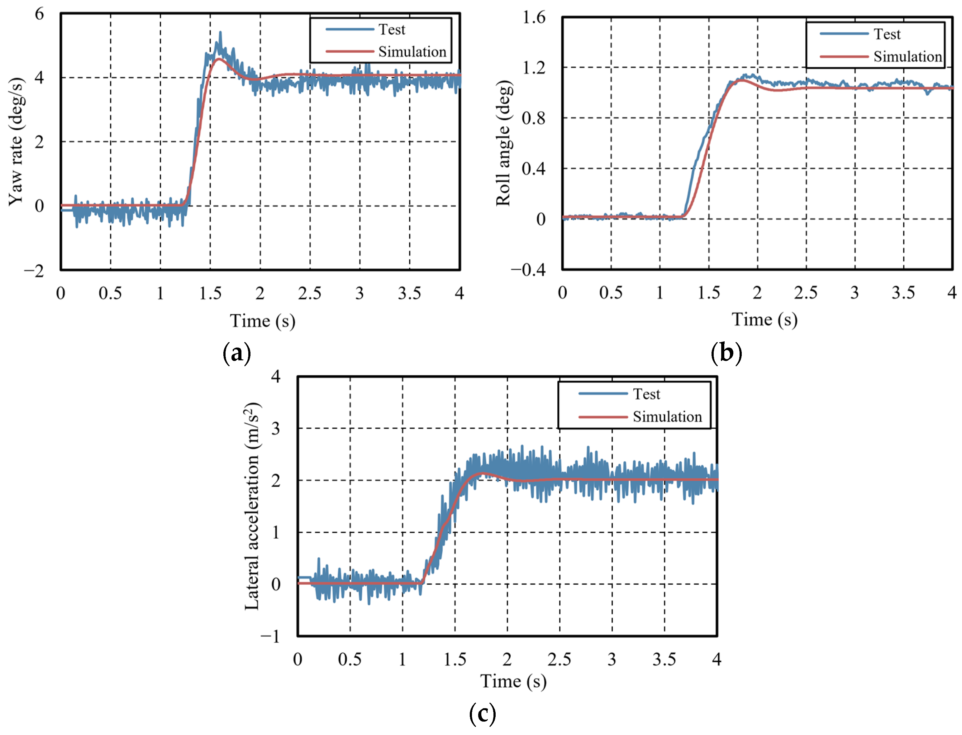 According to the standard GB/T 6323-2014 [46], the steering wheel angle step input test was conducted at a vehicle speed of 100 km/h [47]. Within a rise time of 0.2 s, the steering wheel was turned to a preset angle to achieve a steady-state lateral acceleration of 2 m/s2. During the test, the time course of the yaw rate, roll angle, and lateral acceleration were recorded. The comparisons between the simulation and test curves are shown in Figure 10, while the corresponding parameter results are shown in Table 3. It can be observed that, although some fluctuations exist in the test results, the overall trends of the simulation and test results are consistent, and the steady-state values of all parameters are in good agreement.