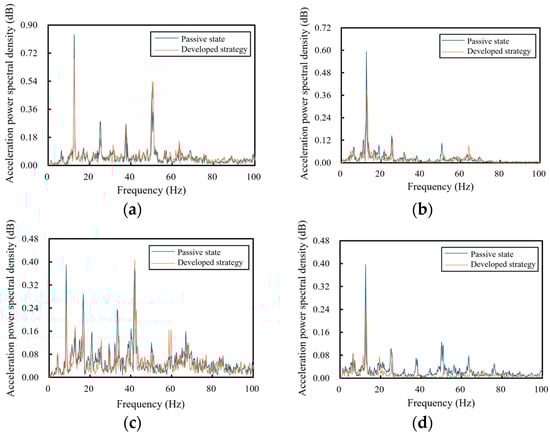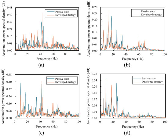 Comparison of vibration acceleration frequency domain curves at 40 km/h. (a) Driver floor vertical direction. (b) Driver seat vertical direction. (c) Passenger floor vertical direction. (d) Passenger seat vertical direction.