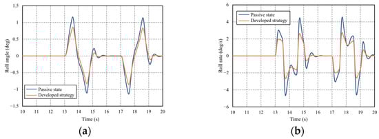 To validate the improvement effect of the developed control strategy on vehicle handling stability, the time course response curves of suspension performance were collected through the double lane change test and acceleration and braking tests [58]. The tested vehicle is consistent with Section 2.2. According to the ISO 3888-1:2018 standard [59], the double lane change test was conducted to evaluate the vehicle lateral motion response characteristics under continuous steering wheel large angle inputs. At a speed of 30 km/h, the steering wheel angle was set as the input, and the time course response curves of the roll angle and roll rate were collected, as shown in Figure 21. The results demonstrate that the proposed control strategy significantly improves the vehicle roll angle and roll rate responses compared to the suspension passive state.