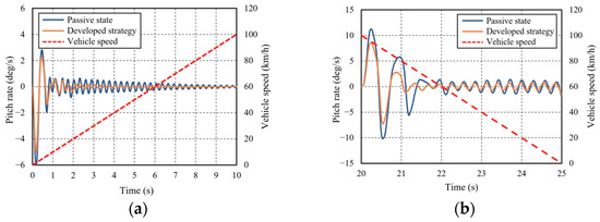 In addition, the longitudinal motion response characteristics under larger longitudinal acceleration input are reflected in the acceleration and braking tests. With the prescribed target vehicle speed input, the time course response curve of the pitch rate was collected as shown in Figure 22. Similarly, the pitch rate in the acceleration and braking processes are lower in the suspension semi-active state than in the passive state. The results demonstrate that the developed control strategy provides excellent body attitude control performance and greatly improves vehicle handling stability.