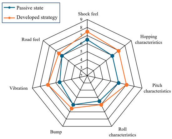 In addition, a subjective evaluation was conducted in parallel with the objective tests [60]. The comparison of the subjective evaluation scores for the suspension passive and semi-active states is shown in Figure 23. Compared with the passive state, the scores of the subjective evaluation metrics in the semi-active state are significantly improved, and the improvement in road feel is especially obvious.