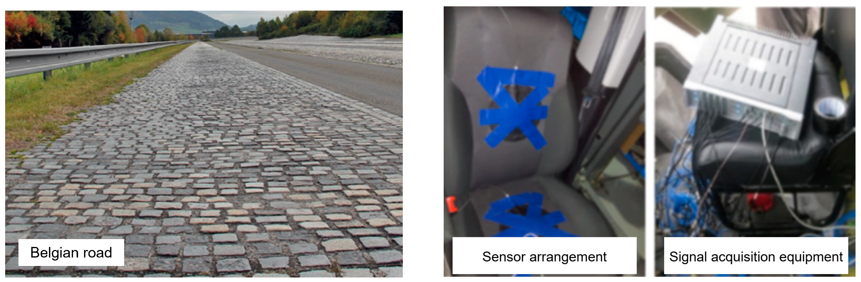 To validate the improvement effect of the proposed control strategy on vehicle ride comfort, vibration acceleration responses were collected through vehicle ride comfort tests. The tested vehicle is consistent with Section 2.2. The tests were conducted at an automotive proving ground by the standard GB/T 4970-2009 [54] and ISO 2631-1:1997 [55]. The Belgian road [56], a typical characteristic pavement for ride comfort evaluation, was selected as the test condition, with vehicle speeds set at 40 km/h and 60 km/h. Since the human body is most sensitive to vertical vibrations, the vertical vibration acceleration RMS value between 0 and 100 Hz frequency band was applied as the ride comfort objective metric [57]. Acceleration vibration sensors were arranged on the seat and floor of both the driver and the rear passenger on the same side to collect vibration signals. Signal acquisition was performed using a 24-channel LMS Test.Lab front-end system, configured with a frequency resolution of 5120 Hz, a sampling frequency of 1 Hz, and a sampling time of 1 s. The test site is shown in Figure 18.