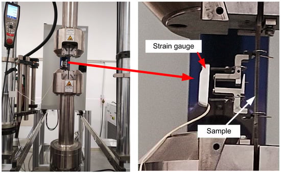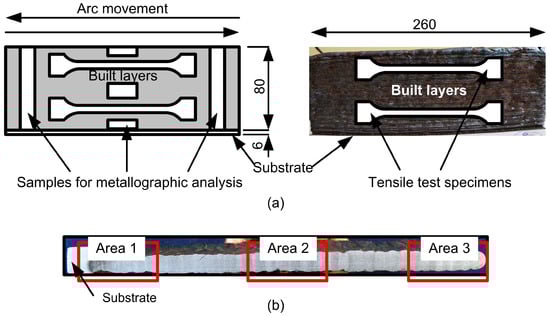 The test specimens were fabricated using a reciprocating motion of the electric arc relative to the workpiece during GMAW-based WAAM (Figure 1a). The arc current ranged from 70 to 170 A, while the travel speed varied between 12 and 30 cm/min. After detaching the substrate, samples intended for metallographic analysis (Figure 1b) were extracted. The deposited metal was then mechanically processed to remove lateral surface irregularities. Flat tensile specimens, prepared in accordance with EN ISO 6892 [], were produced via laser cutting. Tensile testing was performed using an HA-250 servo-hydraulic testing machine (Zwick/Roell, Ulm, Germany) (Figure 2).
