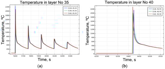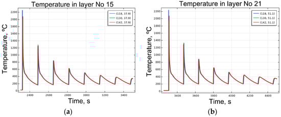 Using the heat transfer model, temperature profiles were traced at control points located 118, 130, and 142 mm from the left edge of the test specimen. These coordinates correspond to the region where the strain gauge was positioned during the tensile tests. To assess potential changes in the metal microstructure due to repeated heating and cooling cycles, only the initial portions of the temperature curves were analyzed. Figure 3 presents temperature curves for layers 15 and 21. The data indicate that, starting from layer 15, the thermal cycles become quite similar. Since each test specimen consists of 40 layers, layer 21 lies approximately at mid-height. The height of a single layer is approximately 2.2 mm. These results suggest that if the specimen is cut at least 30 mm above the bottom edge, the microstructure—and, thus, the material properties—will be consistent across the section. Up to layer 35, the temperature curves remain quite similar (Figure 4a). A noticeable qualitative difference is observed in the final layer (Figure 4b), where no post-deposition heat treatment occurs. These findings confirm that the tested portions of the specimens fall within zones of uniform thermal history.